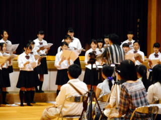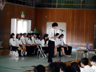 生徒会が一年生に校歌を歌えるように、クラスごとに練習をしました。明日(12日)には全体で練習する予定です。
