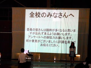 今年度のクラブ・委員会の予算、委員会の予定、東雲祭の予算、予定についての議案が提示され全て承認されました。多くのクラブ活動が3年生から2年生へとバトンが渡されていますが、その後押しをする予算が承認されました。