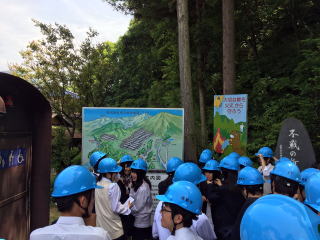 修学旅行に向けての事前学習として、松代大本営を見学しました。32度と真夏のような暑さの中ではありましたが、壕の中では15度ほどで肌寒く感じました。ガイドの方の熱心な説明を聞き、事前に学んだこと以外のことも知ることができました。生徒のお礼言葉の中には「今回学んだことを沖縄で生かしたいです。ありがとうございました。」と戦争についてまた新たな気持ちで、学ぶ姿勢が見えました。
