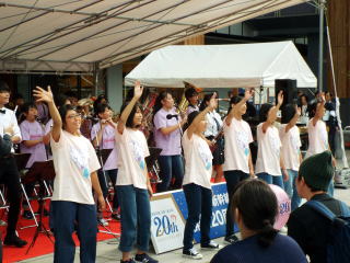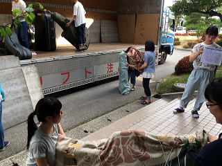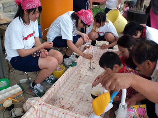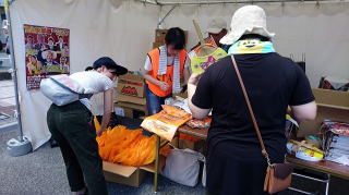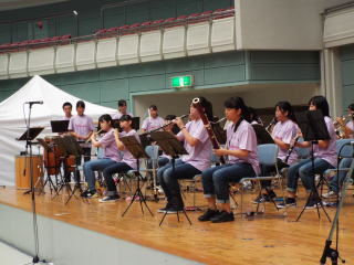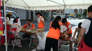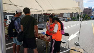 3年生10名 2年生2名 1年生3名 の合計15名で昼の部のボランティアを行ってきました。「伝統工芸体験」では子どもたちの手作り体験のお手伝い、「のど自慢」では放送機器や誘導・点数付け、「ストリートライブ」では誘導、「フードパーク」ではテーブル・椅子のセッティング、その他「スタンプラリー」や「びんずる男」、「配布用うちわ準備」など少人数ごとに様々なお手伝いをしてきました。 大変暑い中でしたが、生徒たちはスムーズに仕事をこなしていたため、事務局の方々に頼りにされ大活躍でした。