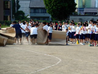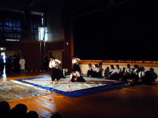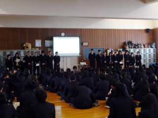 卒業式の準備と3年生を送る会が行れました。担任の先生方などの昔のエピソードや写真が公開され、クイズ形式で出題され、3年1組が見事決勝のじゃんけんを勝ち抜き優勝しました。和やかな雰囲気の中、会が進み、応援委員会から3年生にエールがおくられました。終わりに3年生代表からお礼の言葉があり、くす玉で締めくくられました。