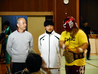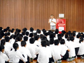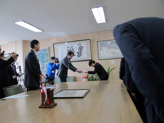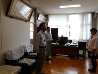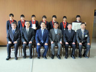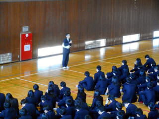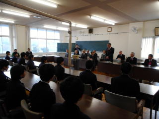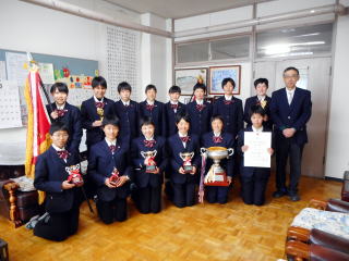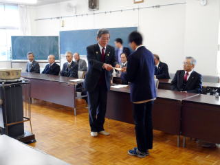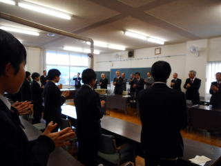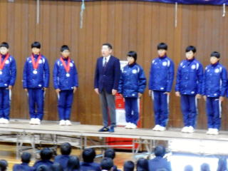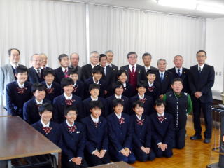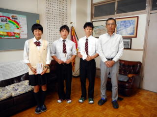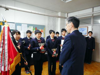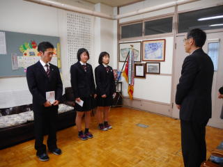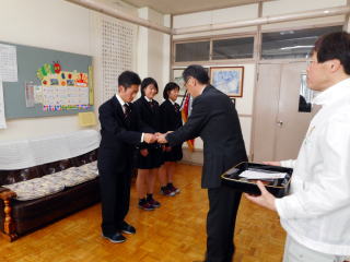 この日の放課後、本校駅伝チームを応援していただいている、大豆島地区自治協議会の方々が訪れました。お祝いの言葉とお祝い金が渡されました。