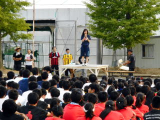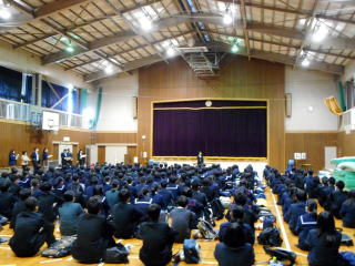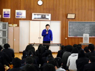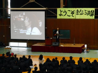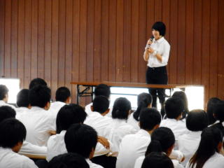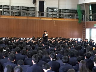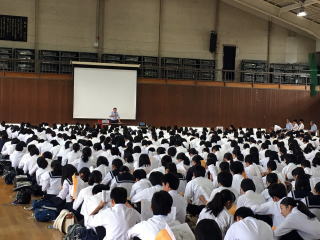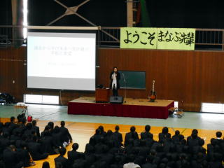 3・4時限を利用して、本校卒業生シンガーソングライターの清水まなぶ氏(本校第11期生)に来校していただき、本校生徒を対象に「過去から学び未来へ受け継ぐ平和と希望」と題し、平和講演コンサートが開催されました。この清水氏の夢の一つである回想プロジェクトとは二度と戦争が起きないように、過去にあった事実(先人たちの体験やメッセージ)を次世代に伝えることで現代社会の生きるヒントや可能性を見出してもらう。聞いてくれた一人ひとりが豊かな心で輝く毎日を過ごしてほしいという願いからこの活動を始めたものです。過去には夢さえ見ることのできない時代がこの日本でもあった。「回想」「TOKYO●0310」「沈まぬ夕陽」の曲で、自身の祖父・東京大空襲・満蒙開拓団・沖縄地上戦の戦争体験談を歌と話で語ってもらいました。 戦争当時、幸せな未来を夢見た人たち、夢を見たくても夢を絶たれた人たち、生きたくても生きることのできなかった人たちが思い描いた未来。私たちが暮らす現代であればそれが実現できる。その人たちのためにも一生懸命目いっぱい今を生き、その思いを繋げたい。必死に受け継いでくれた命に感謝し繋いでいきたい。夢を描いて毎日に感謝し生活してほしい。今日伝えたいことは、感謝の心(心の豊かさ)・平和・希望(夢)の3つ。そして、きみたちの 「可能性は無限大」 であるというお話がありました。そして最後に出会いの奇跡に感謝して、夢を叶えることができなかった時代もあったが、現代ではいつでもしっかりと目標を立てれば、その夢を実現できる時代・世の中である。今を大切に精一杯生き、そのことに感謝し、精一杯努力してほしいとエールが送られました。今当たり前に生活している平和なこの時間、みんなでもう一度平和とは何か自分に問いかけ振り返り、平和・戦争や夢・希望について何かしら考えるきっかけになったのではないでしょうか。 なお、清水氏のtwitterやブログにもこの講演会について触れられ、「自由に夢の描ける平和な時代 なりたい自分にむかって 思いっきり歩んでいってほしいですね みんなまた会おう? LOVE & PEACE」 とコメントが載せられています。