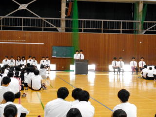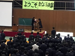 新入生と2,3年生が初顔合わせをする対面式が行われました。生徒会が1年生に記念品の生徒手帳を渡しました。