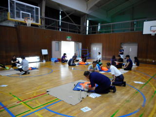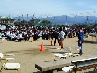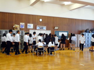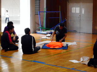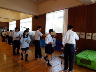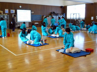 体育の時間を利用し、1年生を対象に、AED講習会が行われました。玉城先生の説明、細田先生と堀先生の実演を真剣に聞き、10個の練習機材を使い3~4人ごとまとまって、実践さながらの練習を行いました。