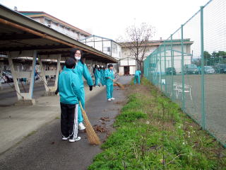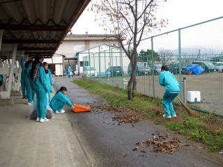 いきなり寒くなり雨天順延かと思いましたが、なんとかくもり空で、途中雨も降りましたが予定通り実施しました。グランド横の正門通路の銀杏の落ち葉が例年大変で、生徒達は側溝や道路上の落ち葉を竹箒で集め、ゴミ捨て場に何回も持って行きました。寒い中、生徒達の一生懸命に取り組む姿、普段の教室の表情とは別の面を見られました。