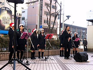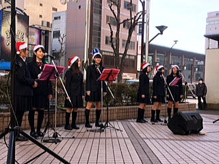 クリスマスイブに、合唱部の生徒が長野東急店入り口前で、本校のOBの清水まなぶさんと一緒にコンサートを行いました。綺麗な歌声に道行く人も足を止めて、聴いていました。