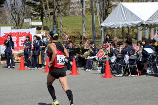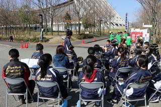 長野マラソン実行委員会から依頼されて、吹奏楽部が例年行っている演奏をMウェーブ前で行いました。曲目は「負けないで」や「アフリカンシンフォニー」を演奏し、ハイタッチをするなど応援しました。