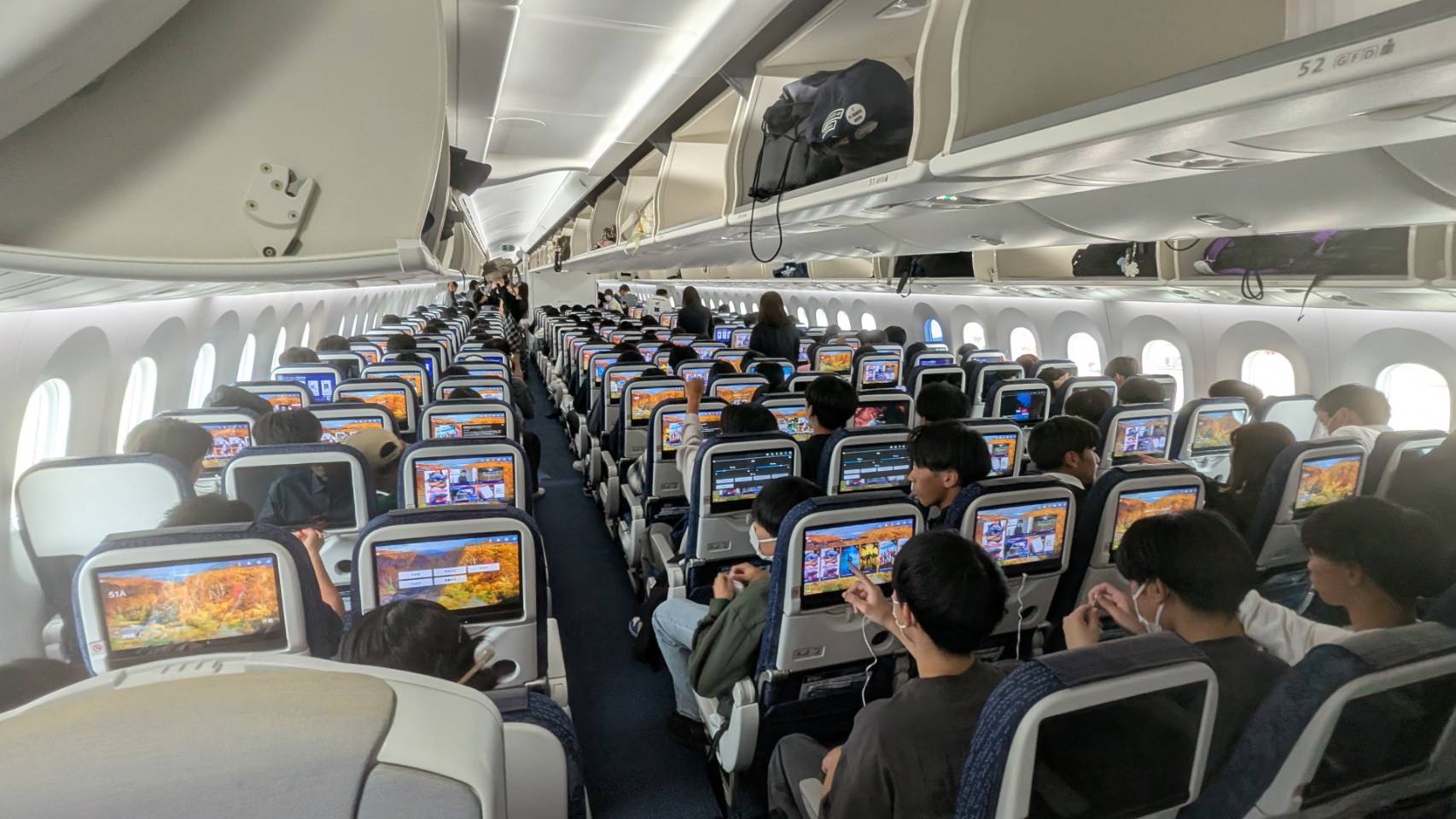 修学旅行1日目は新幹線で東京まで行き、飛行機へ乗り継いで沖縄へ入りました。大多数の生徒が初めての飛行機ということもあり、離陸時着陸時には歓声(悲鳴?)と拍手が機内に起こりました。夕方、沖縄に到着後は、ゆいレールに乗って国際通り周辺へ。各自、夕食と散策の時間となりました。ホテルに戻ってくる頃には、両手いっぱいのお土産を抱えて、とても充実した笑顔で戻ってくる姿がたくさん見られました。