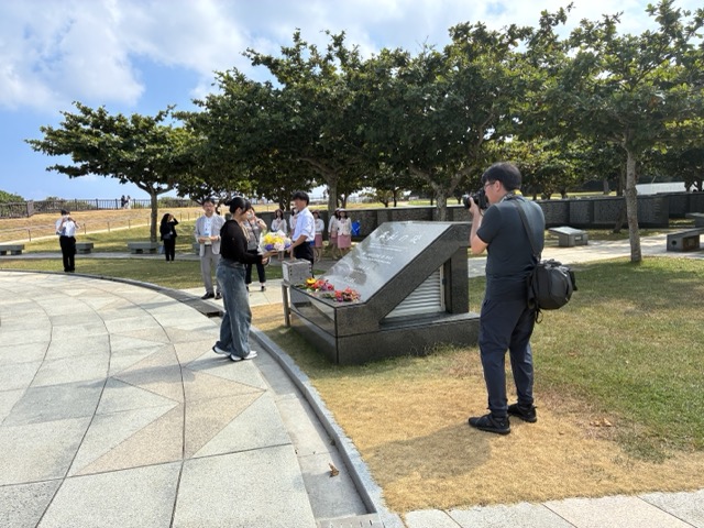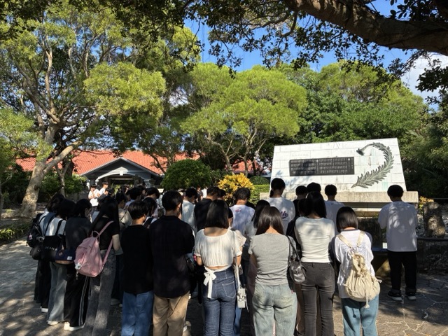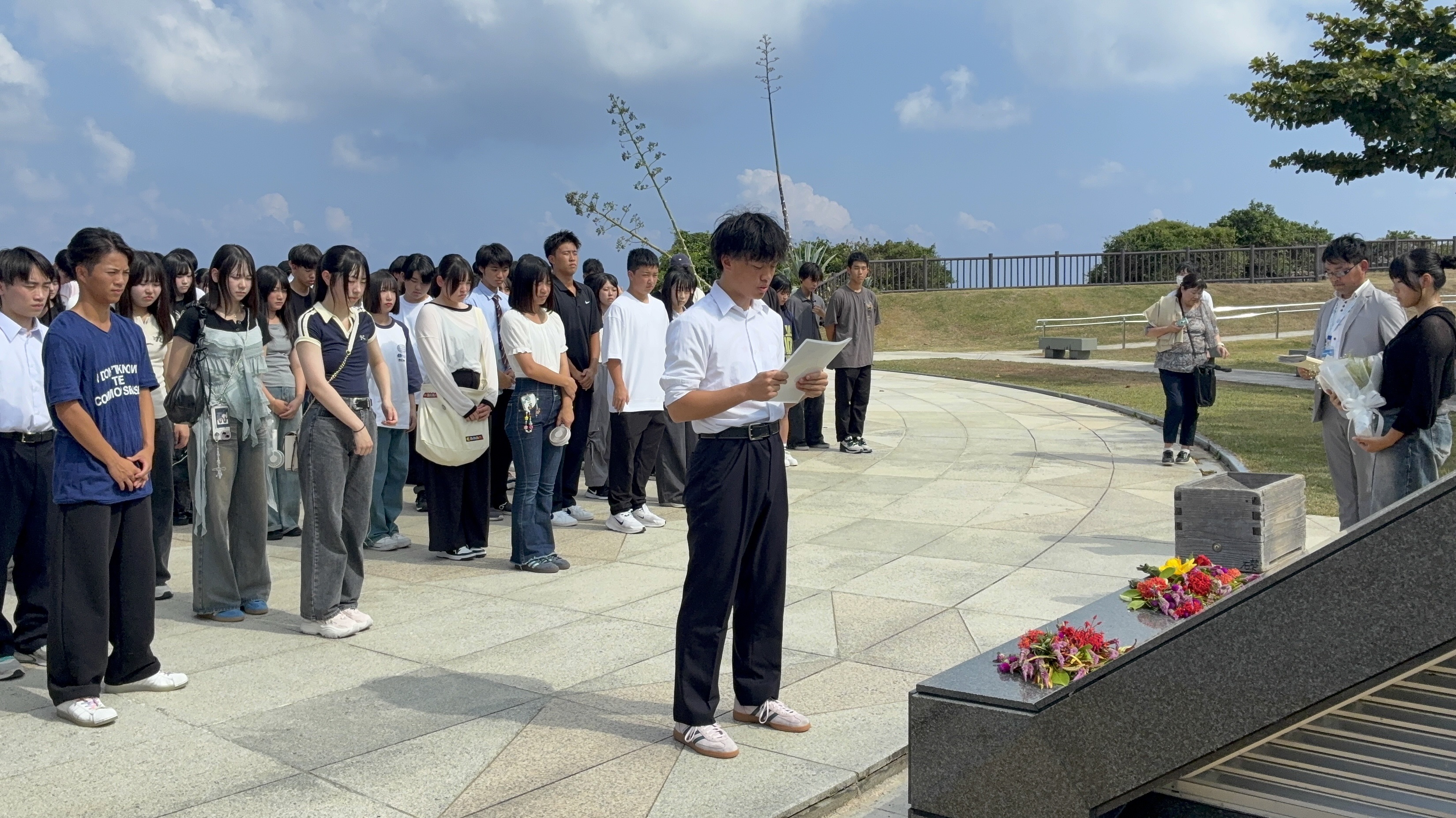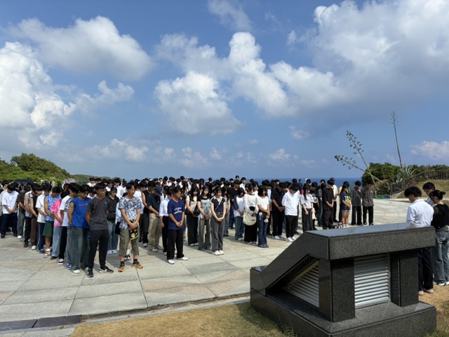 修学旅行2日目は「平和学習」の1日でした。午前中は、「ひめゆりの塔」にて見学をした後、クラスごとに壕へ入りました。実際に悲惨な戦地となった場所に赴き、教科書を読んだり、話を聞いたりするだけではわからない貴重な体験をすることができました。午後は、「摩文仁の丘・平和の礎(いしじ)」へと向かい、学年全員で平和セレモニーを行いました。戦争で命を落とされた方々、そして自分たちが考える平和に思いを馳せながら、第53期生徒会長 宮下蓮生さんが平和宣言を、副会長 宮下風花さんが献花を行い、全員で黙祷を捧げました。
