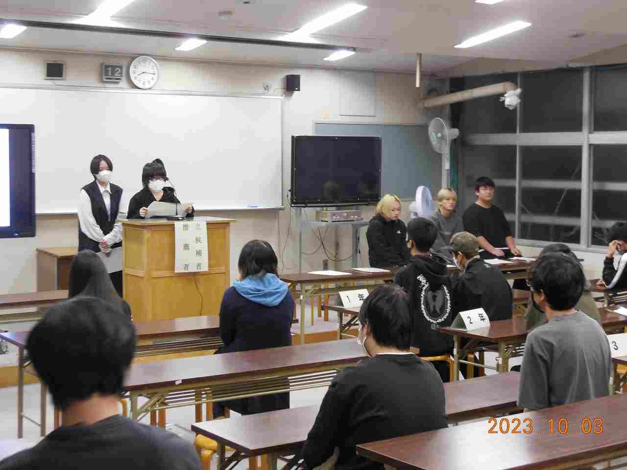 10月3日(火) 生徒会立会演説会・選挙 4年生が中心となって運営してきた生徒会活動も、引継ぎの時期となり、次期生徒会役員を決める立会演説会が行われました。文化祭やクラスマッチなどの生徒会活動で、リーダーシップを発揮してくれた4年生に代わり、新たなメンバーで生徒会運営が行われます。 |