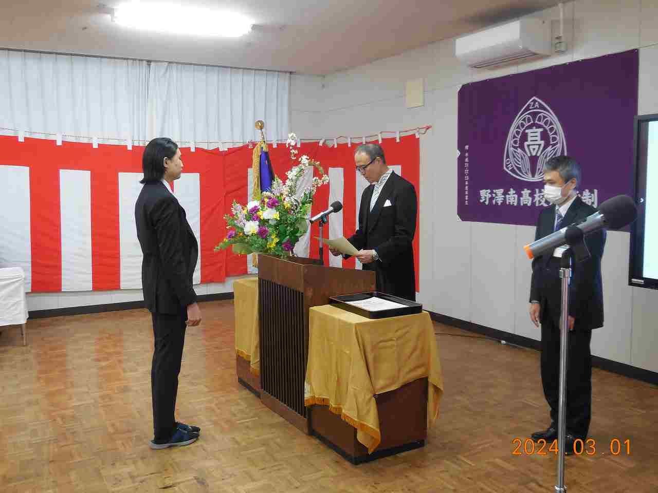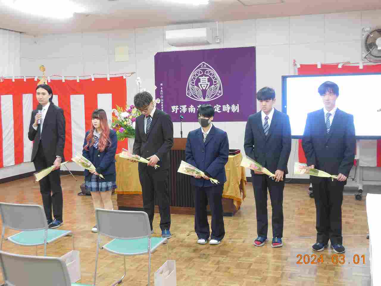 3月1日(金) 令和5年度 卒業証書授与式 教育振興会長様、同窓会長様をはじめ、多くのご来賓の皆様のご臨席を賜り、令和5年度卒業証書授与式が、盛大かつ厳かな雰囲気のもと行われました。 長いようで短かった高校生活。卒業生7名が立派に成長した姿を見せてくれました。恒例となっている卒業生のスピーチでは、緊張した表情の中にも、卒業を迎えた喜びと自信が感じられ、毎年のことながら心が温まる時間となりました。 4月から、それぞれ新しいステージで過ごすこととなります。野沢南高校定時制を忘れることなく、活躍してほしいと思います。 |