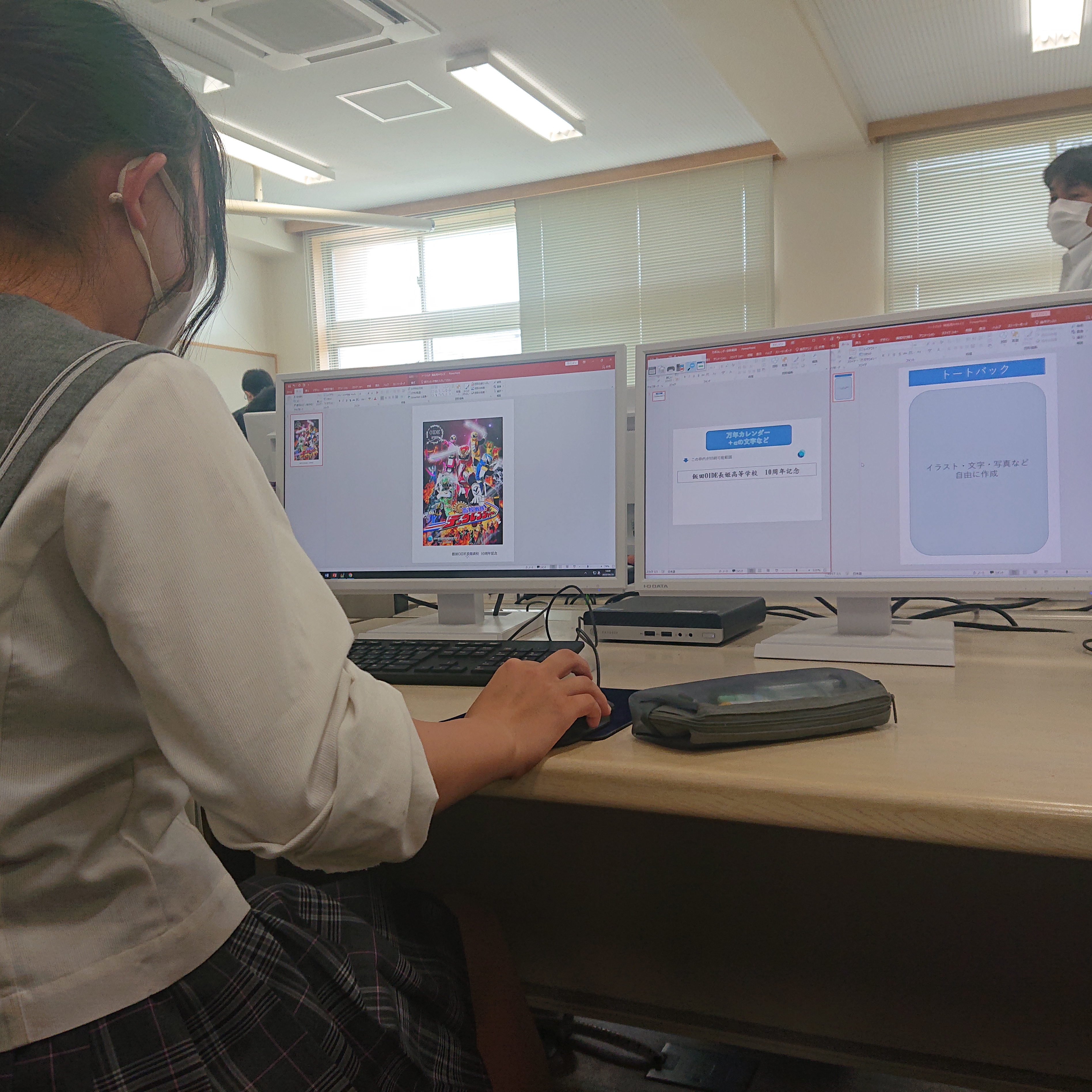 今回は実際にどのようなことをしているのか取材させていただきました。 取材に応じてくれた電気電子工学科の生徒は、「自分たちは万年カレンダーを記念品にしようと考えています。また、万年カレンダーを入れるためのトートバックも現在制作しています。」と教えてくれました。