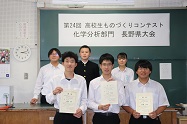 高校生ものづくりコンテスト化学分析部門は「水の硬度測定」をテーマに、分析技術の正確さと結果の精度を競い合うコンテストです。令和6年6月22日(土)に行われた長野県大会では、本校と長野工業高校の生徒が北信越大会出場を賭けて、コンテストに臨みました。
