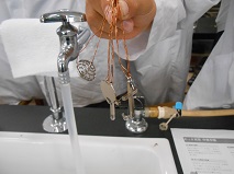 大和電機工業株式会社から2名の講師をお招きし、「電解・無電解めっき法における講義」「電解めっき法による銅板へのニッケルめっきの実演」「無電解法によるニッケル・金めっきの実習」をテーマに学習を深めました。2年生で行っている電気化学実習で学んだめっきの基礎・基本を応用し、真鍮素材にニッケルおよび金めっきを施す技術を体験しました。
