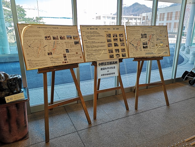 3月1日(水)から3月31日(金)までの1ヶ月間、市役所エントランス玄関において、建築を学ぶ生徒が実習授業でまとめた中野市地域活性案の展示を行っています。