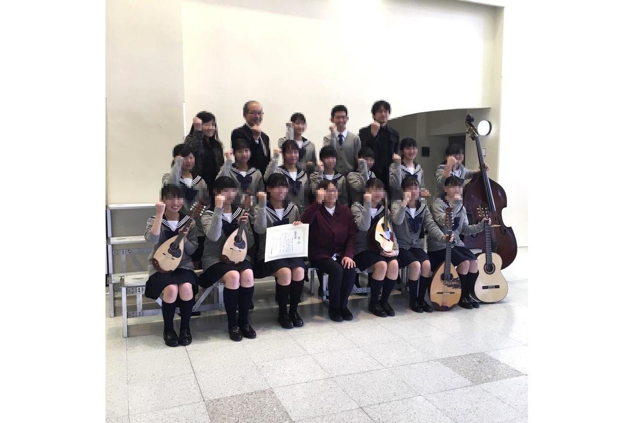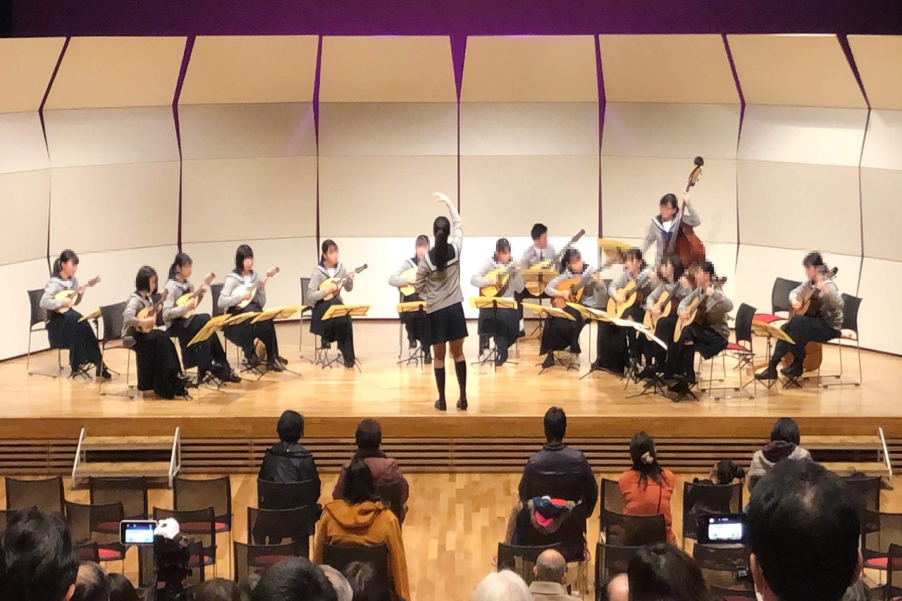 ギター・マンドリンクラブです。この部活はマンドリン、マンドラ、マンドセロ、ギター、コントラバスという5つの弦楽器で構成されており、毎日楽しく活動しています。