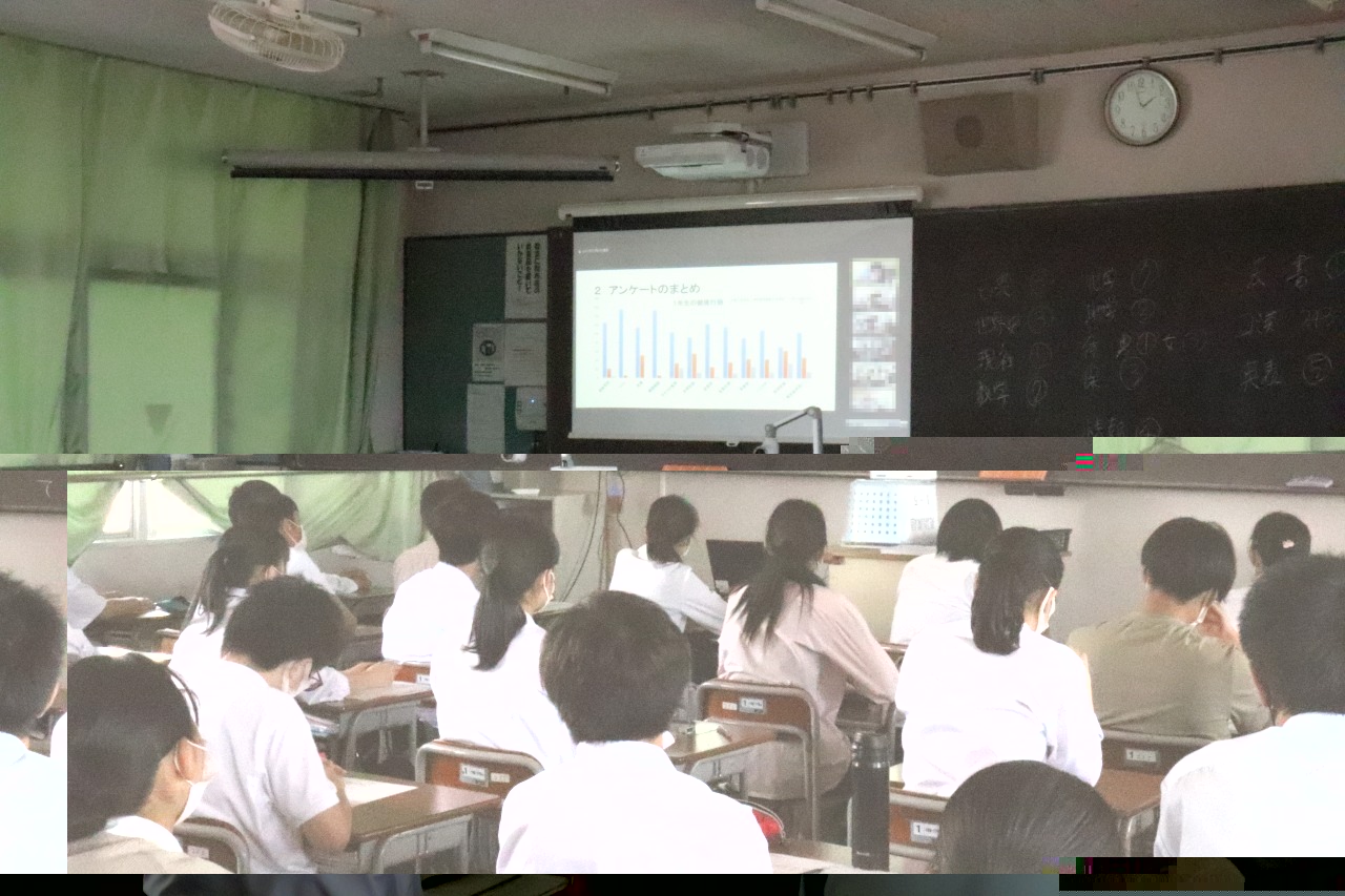 壮行会の後、保健委員会より先日行ったアンケート調査の結果が発表されました。今回はZoomを使用してパワーポイントも使いながらの発表だったため、かなりわかりやすい発表となったと思います。