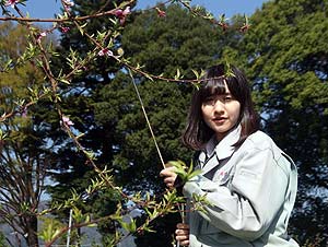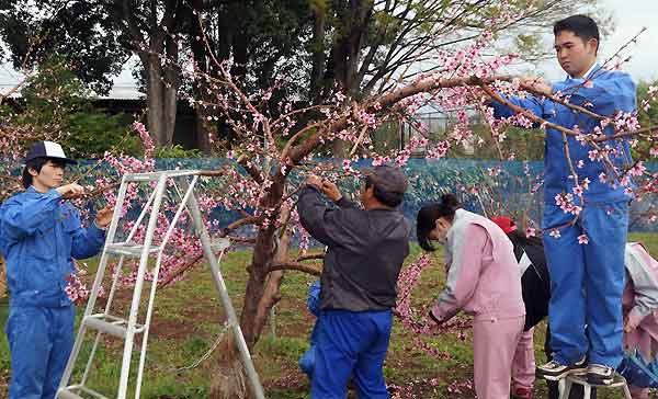 | 園芸クリエイト科果樹科学コース 3年生 15名 2年生 14名 モモ有望品種の栽培開始! 本校栽植のモモ品種 旧来の中生品種以外 晩生品種を中心に多品種栽培 雄性不稔品種への人工授粉を目的 摘花作業・人工授粉開始 「総合実習」 ・ 「果樹」 平成30年 4月9日(月) 〜 13日(金) |