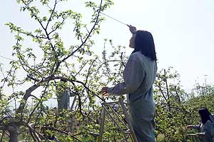 園芸クリエイト科3年 果樹科学コース15名 リンゴの人工授粉用の花・蕾の採取 高温の中人工授粉作業を行う! 今年は天候に恵まれ安定した結実が期待 「総合実習」 平成30年 4月16日(月) 〜 20日(金) |