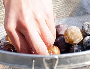 作業終了後のリンゴジュースの試飲 (リンゴジュースはコース選択生より提供) 昨年度収穫の冷凍ブドウの試食 |