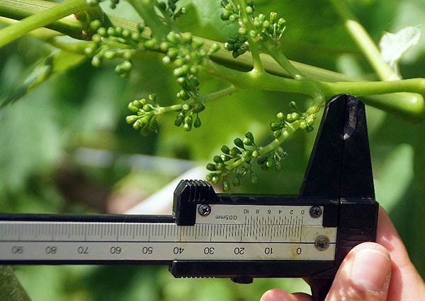 「ルーベルマスカット」品種 花穂伸長を目的としたジベレリン溶液が事前に散布 研究用の花穂の整形を設定 第1支梗を中心に残す |