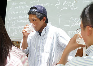 | 作業終了後の試飲 飯田下伊那産 ウメジュース(品種:竜峡小梅) 水で希釈して試飲 |
