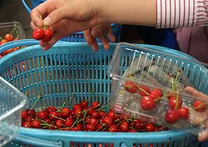 平成25年の晩秋に植えたオウトウ(俗称:サクランボ)が、昨年度から販売レベルでの収穫ができるようになり、FFJ検定中級・上級に関するレポート用に調査研究を実施しています。 6月6日(水)は、中生品種「紅さとう」(別名:山形美人)が収穫期に達したと判断し、2年生が収穫をしました。この品種のグループ担当生徒は、20果そうに結実した果実の外観および品質試験を実施しました。デジタル糖度計で8〜15%位の値で、糖度が低い結果となりました。着色不良果実はそのまま残し、15日(金)に雨天時カッパを着て3年生の選択生が収穫しました。 |