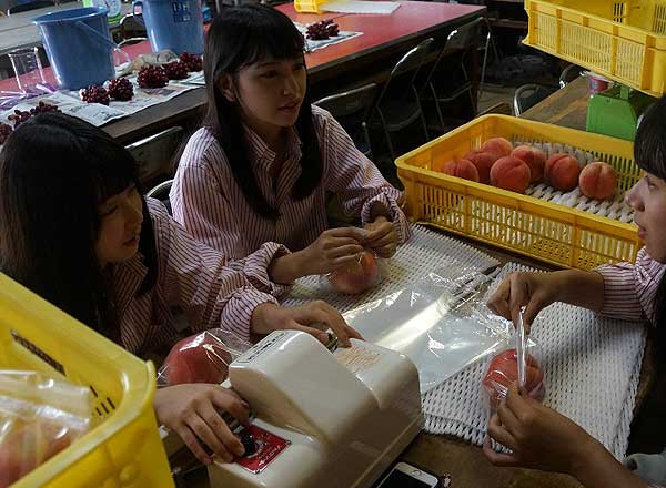 本校栽植のモモは、主に夏季休業明けから収穫される晩生品種群を栽培しています。果樹班は、8〜9月の端境期でのモモ販売に関する研究として、MA包装と氷温貯蔵の試験を実施しました。授業時間だけではなく、放課後の時間も利用して、晩生品種群の品質試験やMA包装を実施し良い研究データが得られました。 |