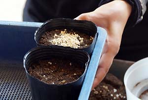 用意された用土(スーパーミックスと畑土の混合土)を2号ポリポットに入れる 指で穴をあける 指で穴をあけ種子を播き覆土 1ポット当たり2粒播く |