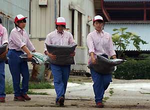 クワを用いて施肥用の溝を掘る 堆肥・野菜元肥(15-8-4)を施しうねを作る うねの完成 うね幅35cm ・ 高さ10cm 畦立て開始 |