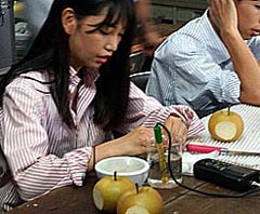 平成30年度中学生体験入学 本校産モモ「なつっこ」品種を糖度測定用に利用! コース選択生全員で果物の糖度測定と味の講座「果物のおいしい箇所を知ろう」に参加し中学生への助言指導を熱心に行う!