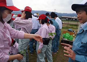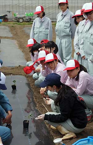 5月9日(火)の昨年度と同一日に、スイカ苗の定植作業を行いました。野菜実習室での全体説明の後、担当職員が圃場で更に説明・実演をしました。育苗ハウスより苗を運びましたが、昨年度と比べてやや成長が劣るものの必要数は確保できました。 定植は植え穴を決め、その場所に手でマルチを破り移植ごてを用いて植え穴を掘りました。深さを調整しながら掘り、スイカを二人3株植え付け、その後、灌水を行いました。その後は、防寒用の囲いを細い竹の棒で固定しました。無事一連の小玉スイカの定植作業を終えました。定植後、2週間程度は天候をみながらの灌水を行うことで、根がつき、夏には収穫物を手にすることができます。 |