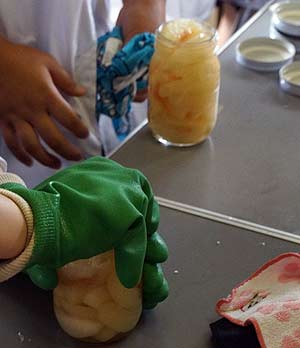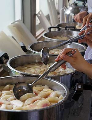 園芸クリエイト科2年果樹科学コース選択の女子生徒が、9月4日(水)に、2時間続きの授業を利用して、モモコンポート作りに取り組みました。当日は早朝登校し、モモ果実を切り準備しました。 モモコンポート作りは、白ワインと砂糖を加え、果肉が軟らかくなるまで煮込めば完成です。初めての体験でしたが、一人450ml入りビン3〜4本を手際よく上手に仕上げました。 モモコンポート作りの数日前の8月29日(木)は、昨年度作り冷蔵保存したリンゴコンポートをバニラアイスと共に試食しました。冷えたリンゴジュースも用意し、暑い日でしたので、充分食味を堪能し楽しい授業ができました。 |