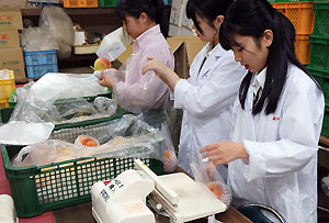 9月30日(月)より3日間、放課後の時間を利用して、果樹班1年生を中心に晩生モモ品種群のMA包装による氷温(0℃)貯蔵を実施しました。また晩生中国系のネクタリン品種「エンパイヤ」の氷温食品認証申請に向け、果実重測定を実施しました。その後平コンテナ単位で品種毎貯蔵されているモモ品種の果実の重さをはかり価格を決定し品種名と共にラベルに記入し、各果実に紙を貼りました。 10月11日(金)は、農場当番の生徒の協力も得て、校外の病院や保育園・公共施設への販売を実施しました。販売を通じて、研究活動の当初の目標が達成できました。短時間での販売を通じて端境期の果物販売の意義を感じることができました。残りの貯蔵中のモモ果実は10月19日(土)の地元JA祭にて販売し一連のモモ果実の研究活動を終える予定です。 |