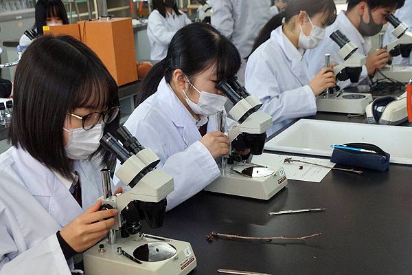 園芸クリエイト科1年生は、2月の「農業と環境」の授業内で4時間、次年度のコース別授業を展開しました。 果樹科学コース選択生は、2月25日(木)は、オウトウ(俗称:サクランボ)をテーマにした、FFJ検定中級・上級に関するレポート用に使用する観察画像を得るために、実体顕微鏡観察を実施しました。具体的には、各グループごとに分かれ、各分担樹から結果枝及び発育枝を採取し、花芽及び葉芽の観察を実体顕微鏡にて実施しました。観察結果をICT機器を使用し大きく映しながら、葉芽と花芽の違いについて学習が深まりました。 |