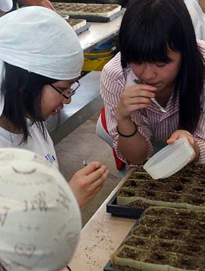 平成30年度 飯田東中学校との 第1回「花いっぱい交流」 本校草花実習室にて フレンチマリーゴールドの播種を通じた交流 長野県下伊那農業高等学校農業クラブ 平成30年 5月18日(金) 中間考査終了後の放課後 |