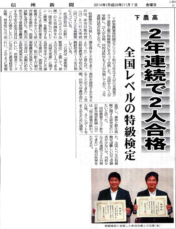 平成26年11月7日 1面 南信州新聞社様の許諾をとり掲載