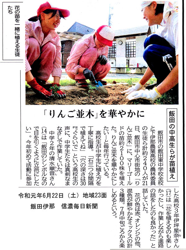 6月18日(火)に本校農業クラブは、恒例の飯田市立東中学校との第2回「花いっぱい交流会」を、飯田市内リンゴ並木にて実施しました。フレンチマリーゴールドの植え付けを飯田東中学校生徒と行い、和気あいあいとした雰囲気の中でとても充実した交流ができました。