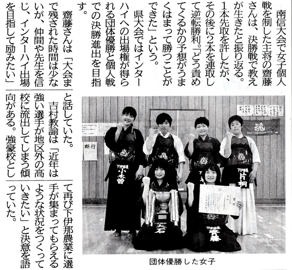 平成28年度 校友会応援委員会企画 選手壮行会を開催 平成28年 5月23日(月) 農業クラブ校内発表会後 県大会出場を決めた選手を激励・壮行 地方紙が剣道班女子 南信大会 団体・個人優勝を大きく報道! |