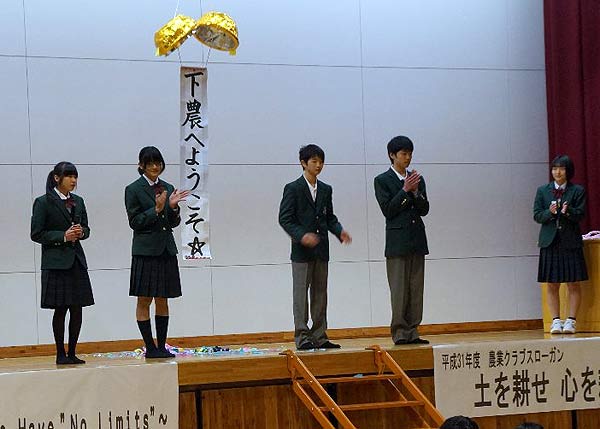 4月5日(金)は、各学科の校友会役員生徒の先導で2,3年生の拍手の中、体育館へ新入生が入場しました。校友会長、校長先生の挨拶の後、下農生の一日の制作ビデオ、平谷村との交流に関する農業クラブ活動の紹介がありました。2.3年生が校歌の歌い方の紹介を終えると、新入生の各クラス代表生徒が壇上に登壇しました。クス玉を割ると歓迎の文字が現れ、その後新入生が、学校生活の抱負を述べました。 午後は校友会説明会や農業クラブ説明会があり、農業クラブ役員、校友会役員生徒が紹介されました。 |