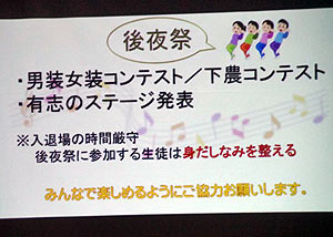 本校校友会では、校友会最大の行事である第65回稲丘祭の成功に向け、第2回稲丘祭ガイダンスを開催しました。9月19日(木)LHRの時間を利用して、昨年度の稲丘祭を振り返りつつ、今年度の稲丘祭企画の概要や進捗(しんちょく)状況などについてガイダンスを行いました。残り42日を切る中、第65回稲丘祭に向け、本格的な準備が進められます。