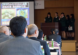 1月31日(金)にJAみなみ信州「正組合員セミナー」が本所にて開催されました。本校からは、アグリ研究班地域交流部及び果樹班が数ヶ月前から活動発表の依頼を受けていました。当日は各班15分間の発表と共に関係の農産物や商品を販売しました。セミナー参加者やJAの方々が購入してくれ、盛況にて販売を終えられました。