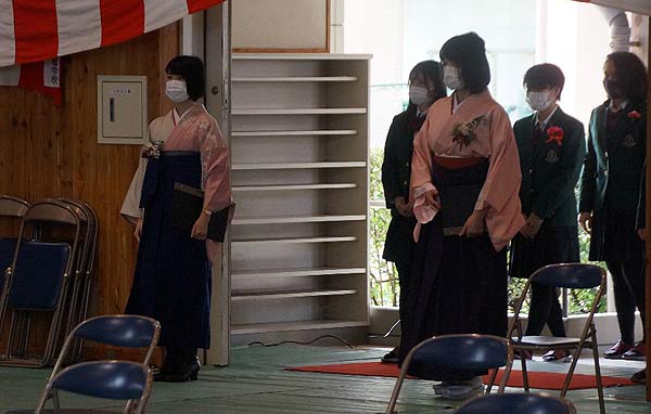 令和3年度卒業証書授与式が3月6日(土)に挙行され、3年間の学舎を、卒業生157名が思い出を胸に刻み巣立っていきました。当日は保護者の皆様は別会場の体育館での映像を見る形式ではありましたが、厳粛な雰囲気の中で式が進行し、大変感慨深いものがありました。