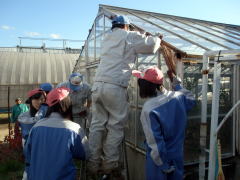 (1)ガラスの補強(追加):ガラスのない場所が数カ所張り替えを行った。張り替えるだけで、ガラス温室内の温度が2℃程上昇しました。 (2)鉄骨のサビ防止:サビ防止剤を塗る前に、昔からついているサビをスポンジではがしました。その後、数人のグループに分かれて、ハケを用いてサビ防止剤を塗布しました。 今回の修繕を通して、ガラス温室がよみがえり、あと7年後の100周年まではなんとかもつことができそうです。参加した生徒達からも「早く食べたい。」「これで寒くても枯れることがないよね。」「ガラスを張り替えただけでも少し大きくなったような気がする」「卒業してもミカンの様子を見に来る」などの感想が多くありました。 今後は今回実施に参加した3年果樹専攻の生徒達の思いを大切に、果樹専攻の生徒達と共にしっかり管理していきたいと考えています。また、次年度から生徒の課題研究のテーマの一つとして取り入れたいとも考えています。 |