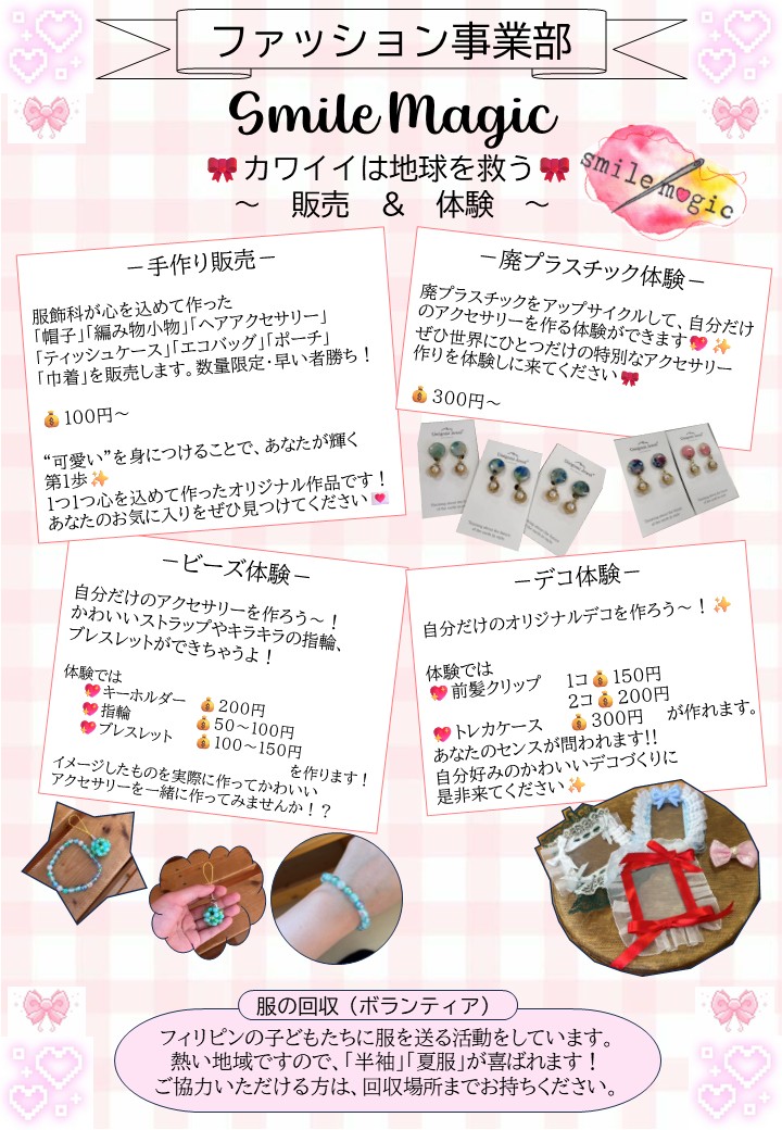 私たち服飾科が心を込めて作った「帽子」「編み物小物」「ヘアアクセサリー」「ティッシュケース」「エコバッグ」「ポーチ」「巾着」を販売します✨