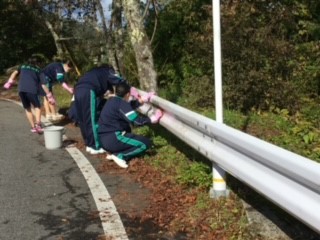 南木曽町、妻籠観光協会、天白区のご協力のもと、1学年は妻籠宿の公共施設の清掃活動、2学年は、①田立の高齢者介護施設「木曽あすなろ荘」の外構清掃、②沼田、天白地区のカーブミラーの清掃、③天白地区のガードレールの清掃、④天白地区の道路の落ち葉回収の計5ヶ所で行いました。