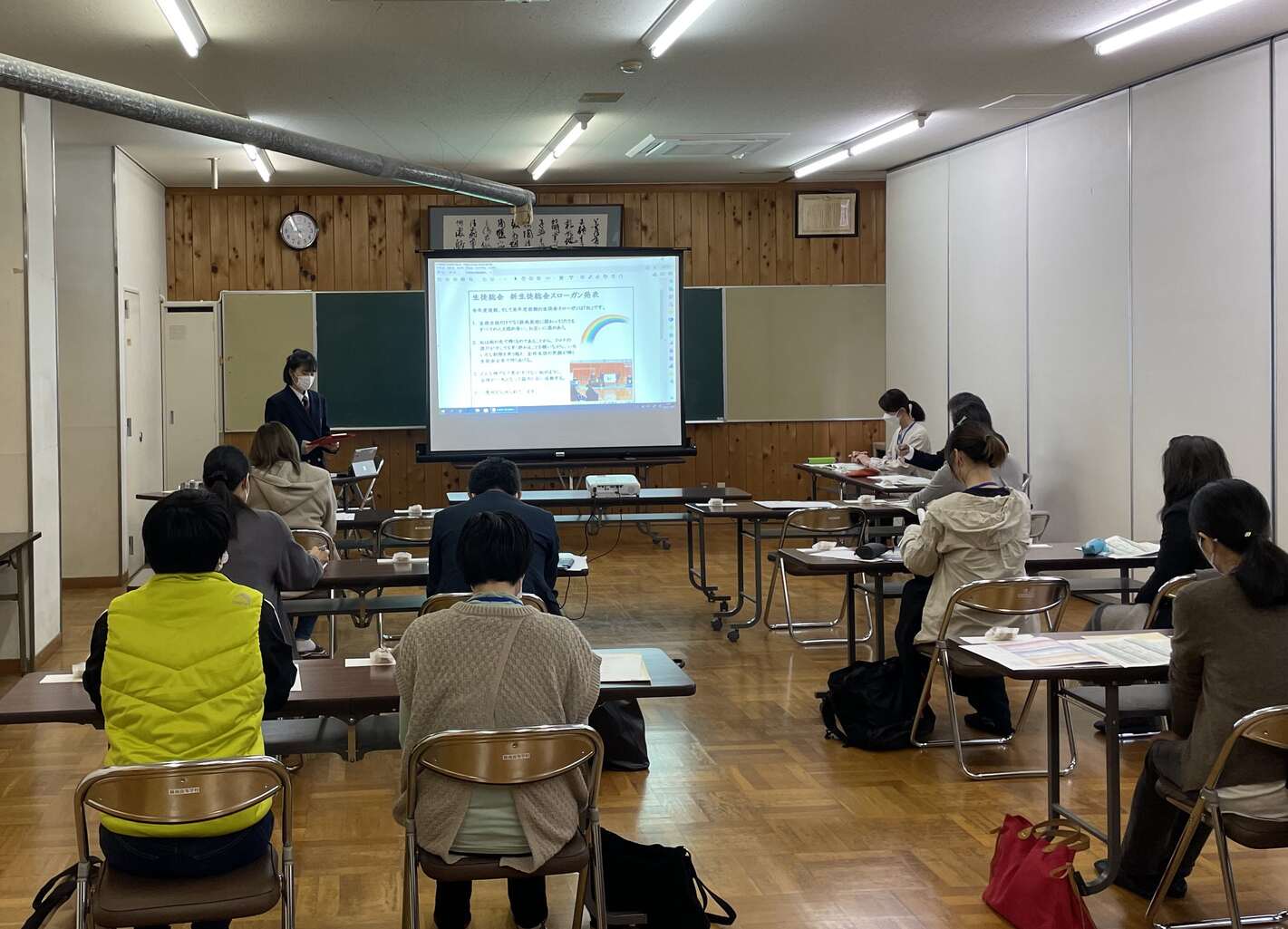 はじめに、校長先生より本校の学校づくりに関する報告をし、その後、生徒会と3学年総合探究のグループより、それぞれの取り組みについて発表をしました。生徒会長は、新しいスローガンの「虹」について説明をし、「虹」に込められた思いについて語りました。また、総合探究の報告は、「ほたるの星」というテーマのグループが担当しました。