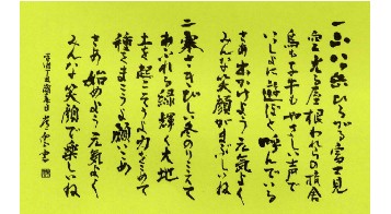 二 寒さきびしい冬のりこえて 空光る屋根われらの校舎 あふれる緑輝く大地 鳥も子牛もやさしい声で 土を起こそうよ力をこめて いっしょに遊ぼと呼んでいる 種をまこうよ願いこめ さあ出かけよう元気よく さあ始めよう元気よく みんな笑顔がまぶしいね みんな笑顔で楽しいね |