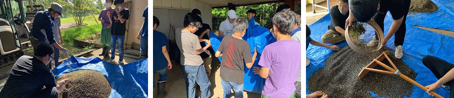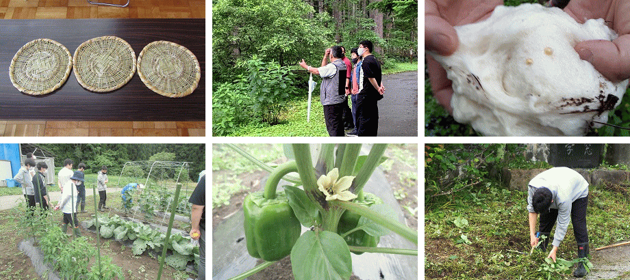 本日の総合的な探究の時間から。(上段左)「竹細工」チーム(後半)のそばざるが完成しました。丸く作るのはなかなか骨の折れる作業ですが、見事な作品に仕上がりました。(上段中・右)「色々体験」チームは、モリアオガエルの卵の様子を観察に行きました。泡巣(卵塊)の中に卵を見つけました。(下段)「晴耕雨読」チームは、農場の野菜の様子を見回った後、除草作業の後片づけなどを行いました。少しずつ野菜が採れ始めています。